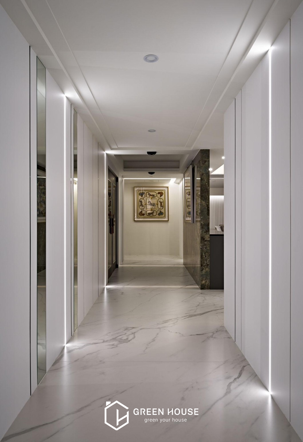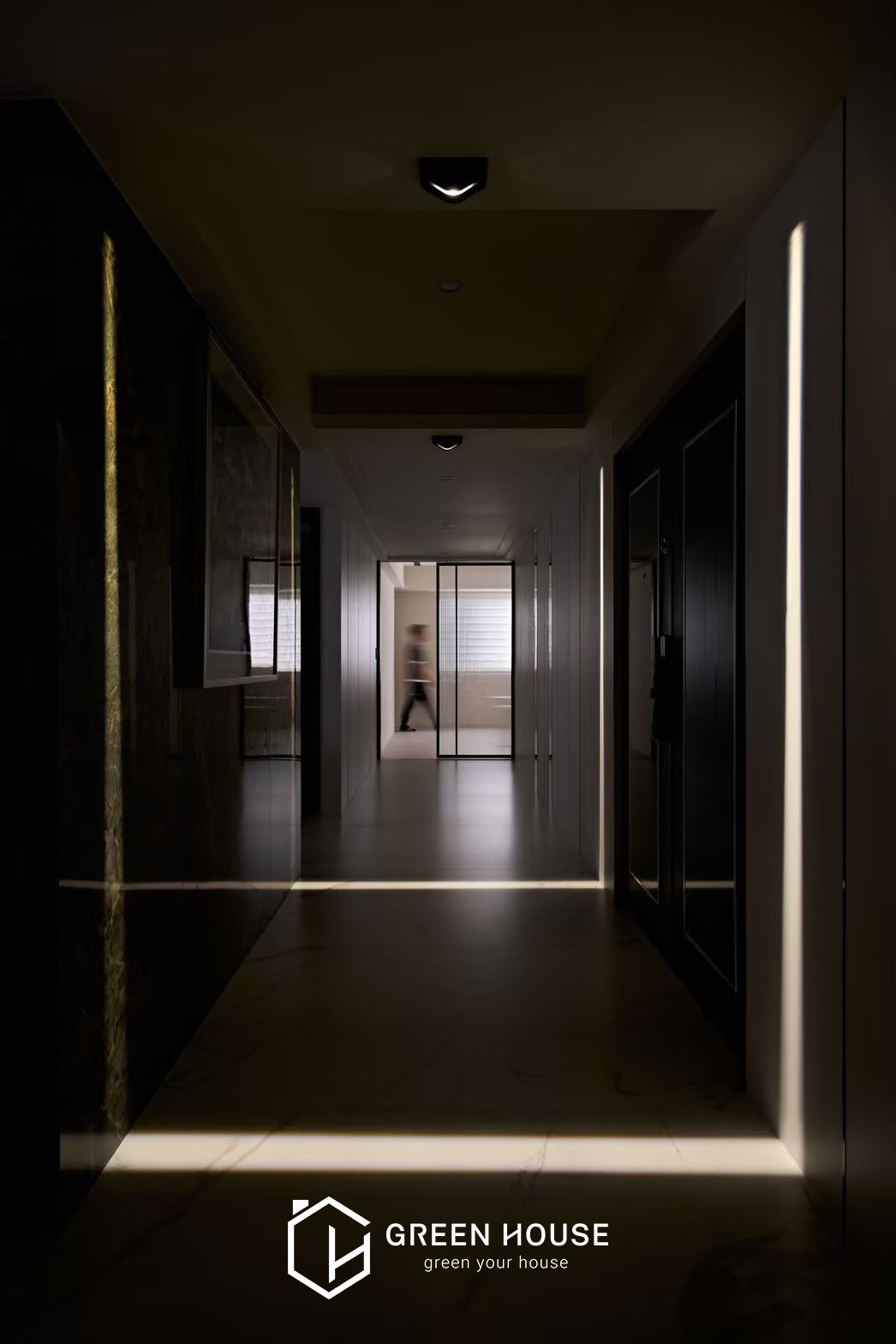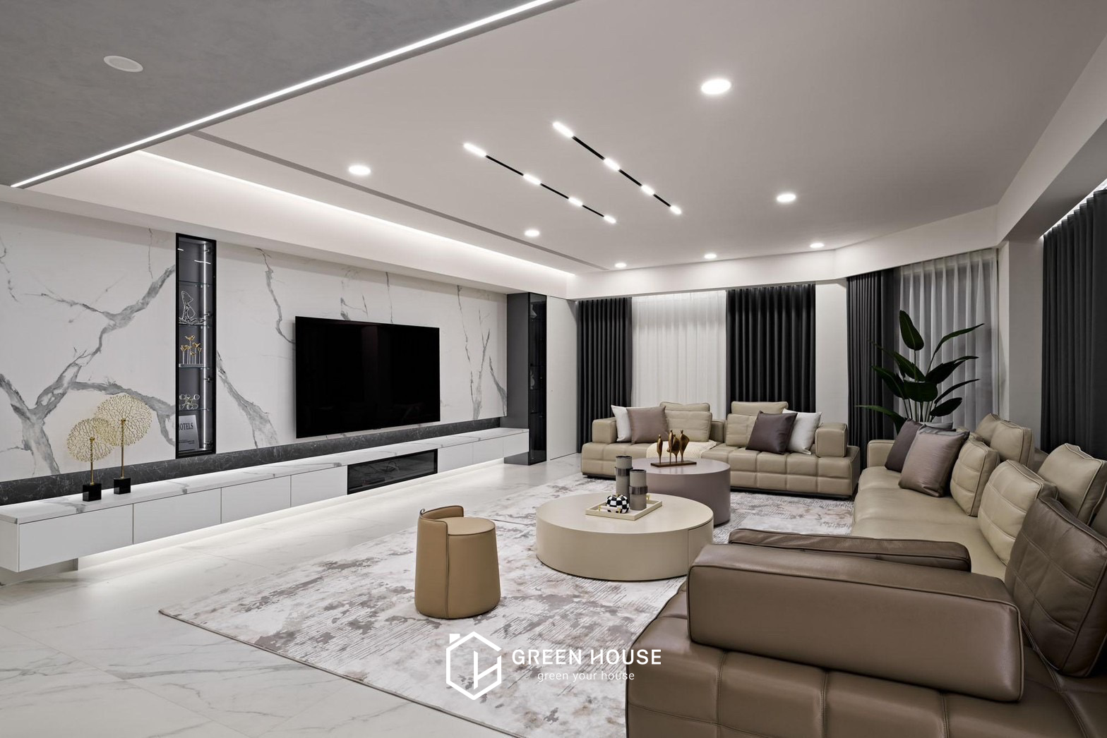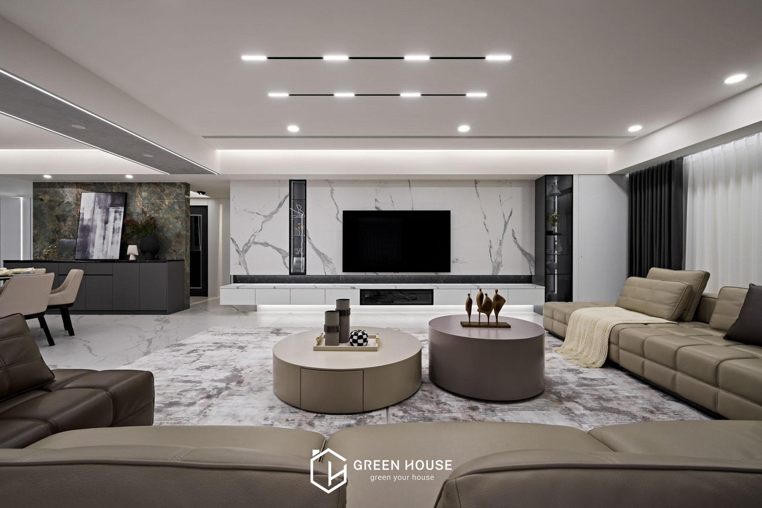 座落位置 桃園新屋區 建築形式 電梯大樓 空間坪數 82坪 格局規劃 五房兩廳 主要建材 大理石、磁磚、藝術漆料、玻璃、鐵件、木地板、繃布等 設計風格 公領域採用灰、白、黑為主色調,私領域以淺暖色為主, 磁磚的清冽與知性、木質地板的溫潤與舒適,進行鋪展於 82坪的室內空間裡。本案以注重動線的開放式格局做為設計主軸,整體行徑動線流暢直覺,更能突顯天然石材與精 緻磁磚的細緻表現,空間的精心設計既展現品味,又滿足實際需求。