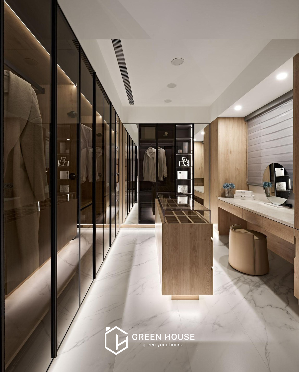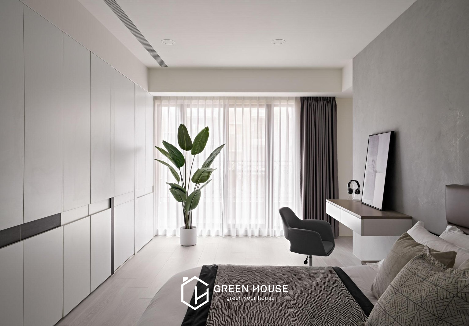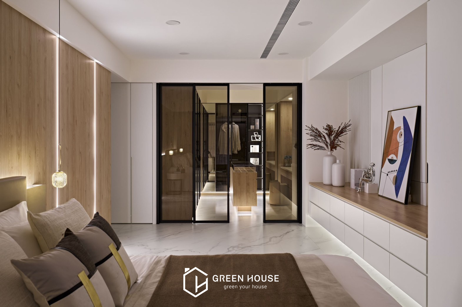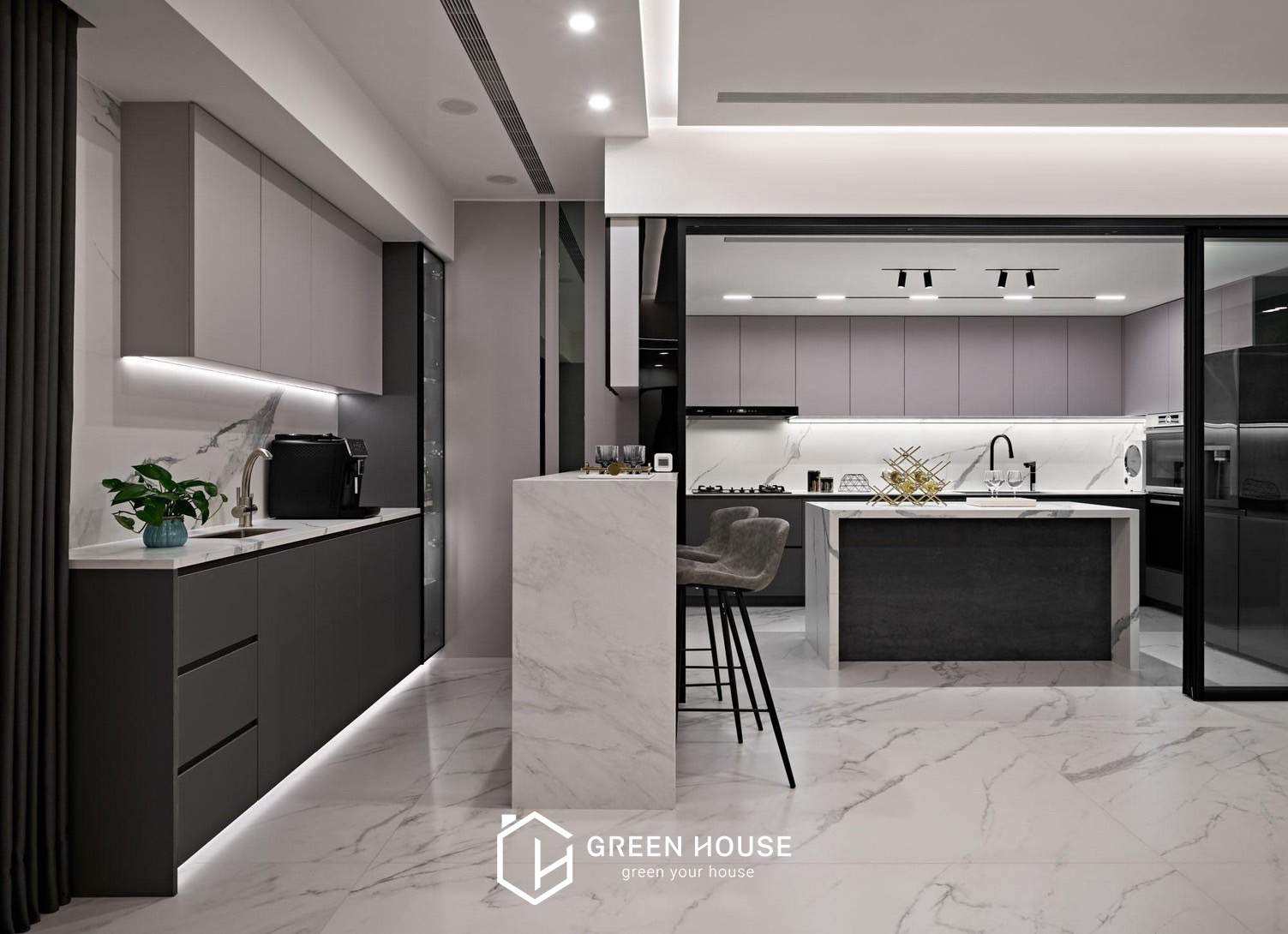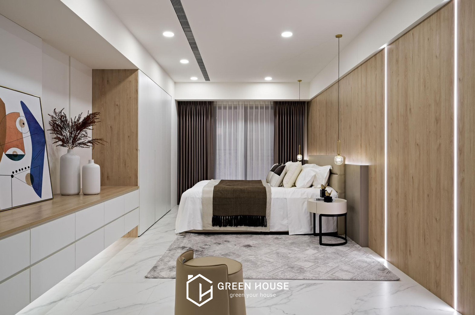 座落位置 桃園新屋區 建築形式 電梯大樓 空間坪數 82坪 格局規劃 五房兩廳 主要建材 大理石、磁磚、藝術漆料、玻璃、鐵件、木地板、繃布等 設計風格 公領域採用灰、白、黑為主色調,私領域以淺暖色為主, 磁磚的清冽與知性、木質地板的溫潤與舒適,進行鋪展於 82坪的室內空間裡。本案以注重動線的開放式格局做為設計主軸,整體行徑動線流暢直覺,更能突顯天然石材與精 緻磁磚的細緻表現,空間的精心設計既展現品味,又滿足實際需求。